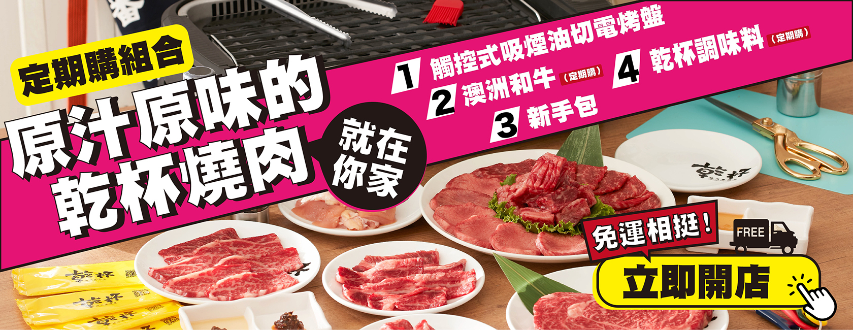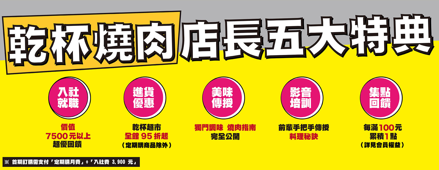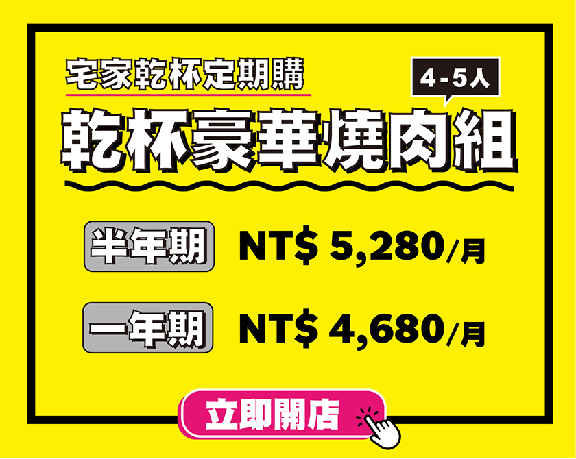 乾杯燒肉居酒屋定期購商品:指定加購項目為「乾杯入社費」共新台幣 3900 元,入社並完整履行當次訂購期數,即可免費獲贈價值新台幣 7500 元以上的 "開店設備",包含觸控式吸煙油切電烤盤、乾杯新手包,以及不定期更新之雲端教學及定期購期間於乾杯超市購物全館 95折優惠(定期購商品除外)。