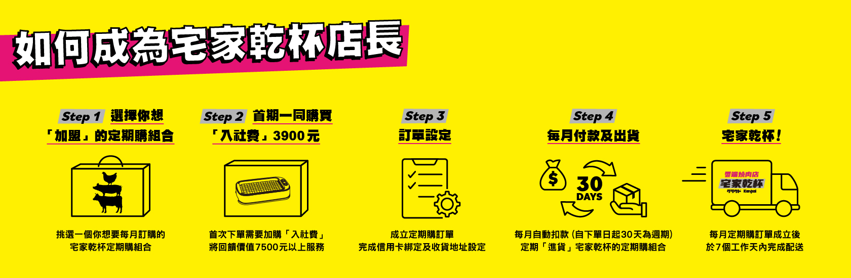※宅家乾杯店長於完整履行首次訂購期數後,始獲得開店設備之所有權,若未能完成指定條件,宅家乾杯得撤銷其贈與,並請求您給付相關價額。