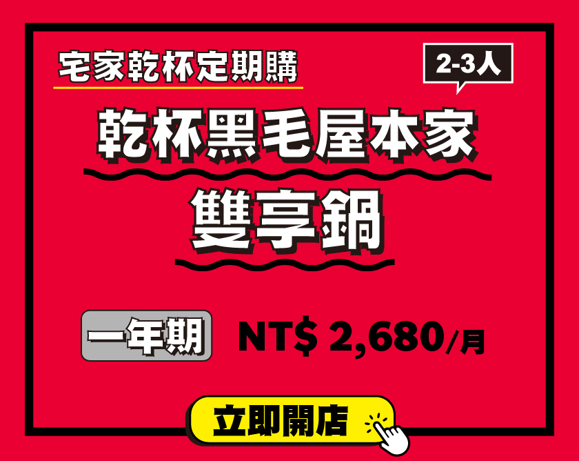 黑毛屋本家定期購商品:指定加購項目為「黑毛屋入社費」共新台幣 3900 元,入社並完整履行當次訂購期數,即可免費獲贈價值新台幣 6590 元以上的 "開店設備",包含鐵板萬用鍋、黑毛屋新手包、料理家養成計劃食譜,以及不定期更新之雲端教學及定期購期間於乾杯超市購物全館95折優惠 (定期購商品除外)。