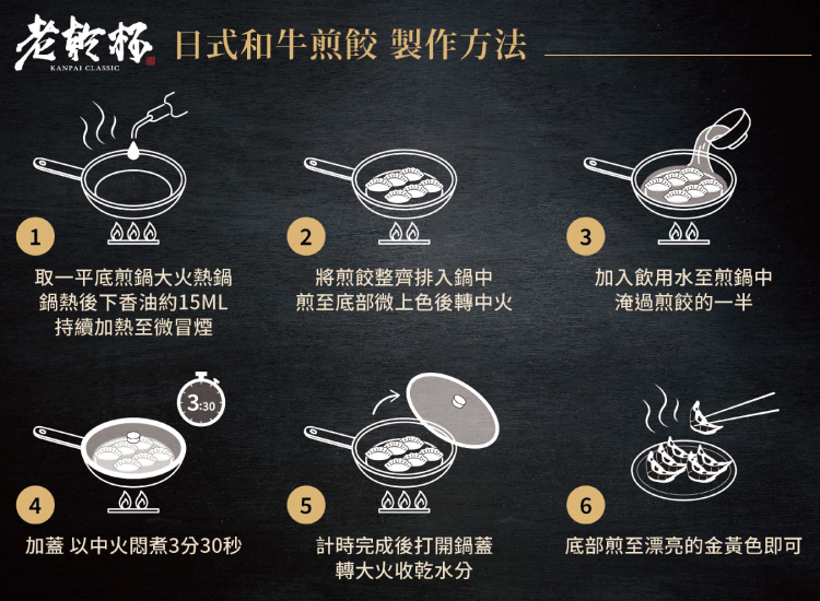 冷凍取出不需退冰,以平底鍋及少許油、水,約10分鐘即可快速上桌,享用酥脆外皮,內餡飽滿多汁的煎餃。輕鬆在家享受星級美食饗宴。