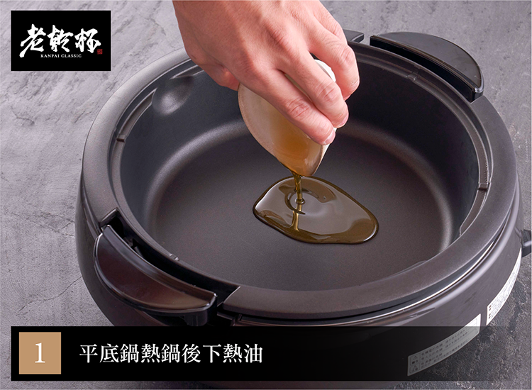 1) 取一平底煎鍋大火燒熱,鍋熱下香油約15ML,持續加熱至微冒煙。