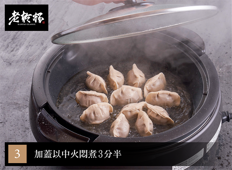 3) 加入飲用水至煎鍋中,淹過煎餃的一半,加蓋、以中火悶煮3分30秒。
