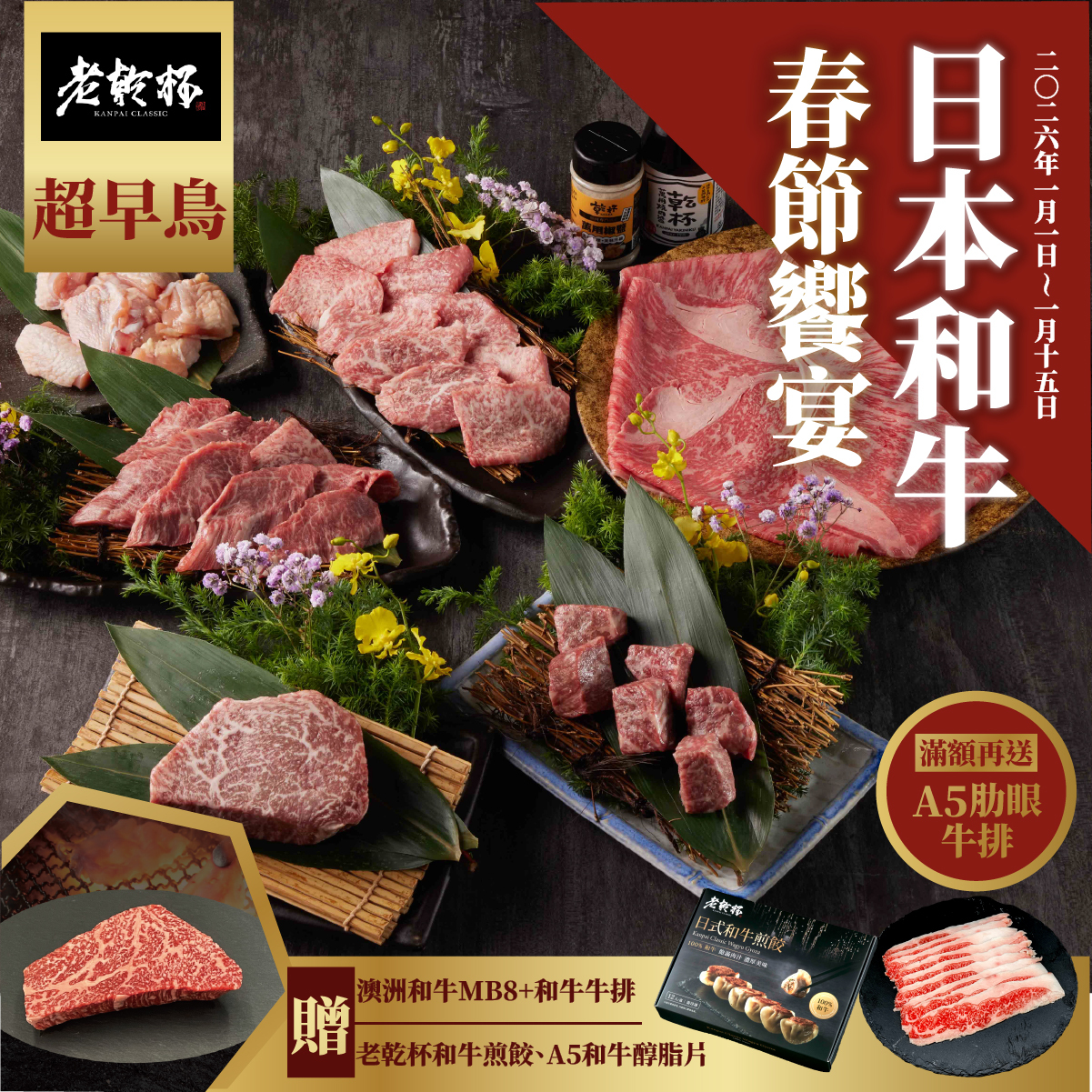 2026-01-15T16:00:00.000+00:00截止 指定商品,【春節慶】1/1-15 指定燒肉、牛排禮盒 贈老乾杯日式和牛煎餃 12入/盒 乙件 (每筆訂單限贈乙件,數量有限,送完為止,不得與其他優惠併用)