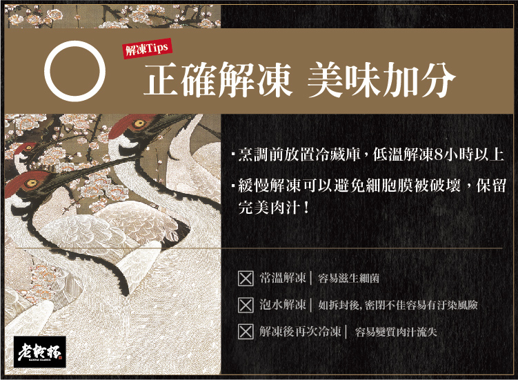 烹調前放置冷藏庫,低溫解凍 8 小時以上。緩慢解凍可以避免細胞膜被破壞,保留完美肉汁