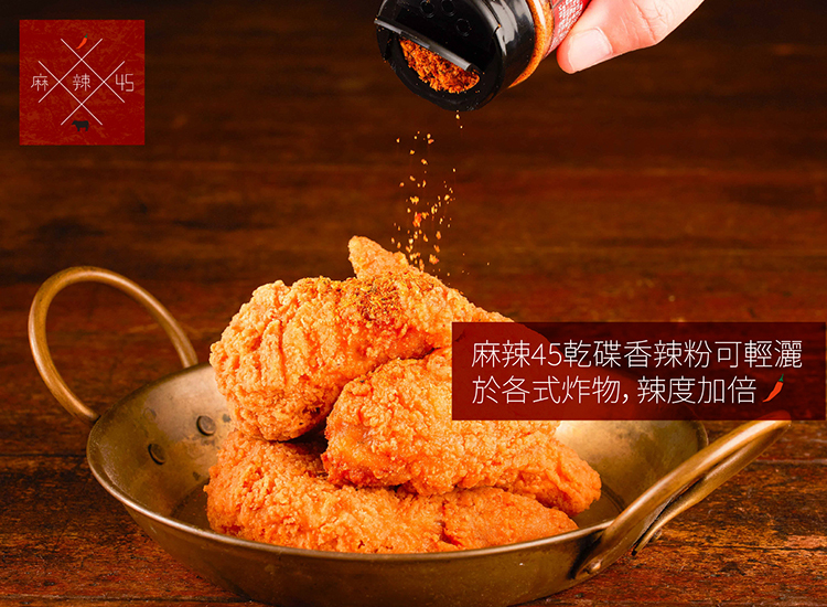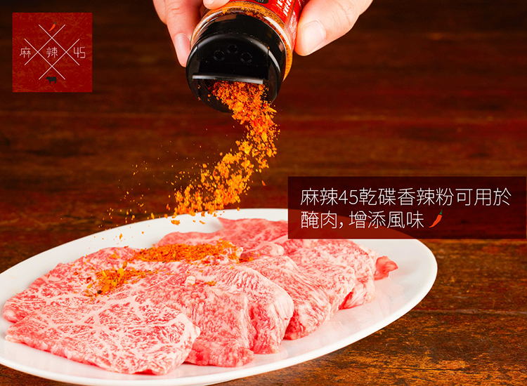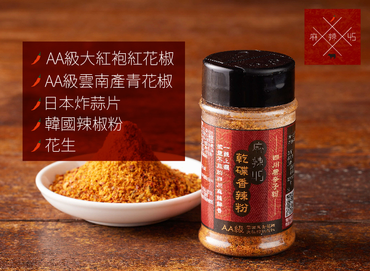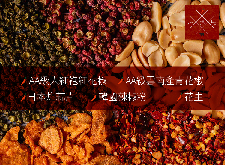 麻辣45嚴選AA級雲南青花椒、四川大紅袍紅花椒、日本炸蒜片、韓國辣椒粉特製;