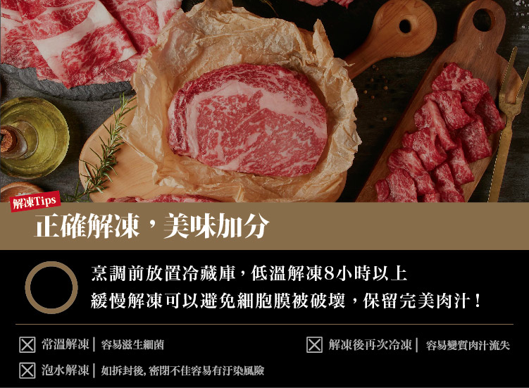 烹調前放置冷藏庫,低溫解凍 8 小時以上。緩慢解凍可以避免細胞膜被破壞,保留完美肉汁